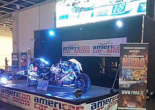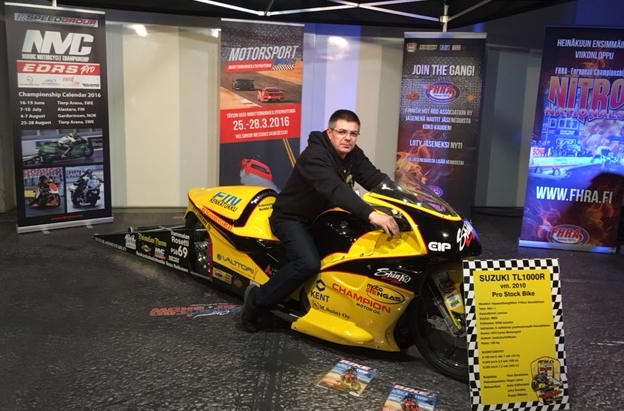 Speedgroup´s board member and EDRS marketing director Roger Lyrén sends a brief update from the MC show in Helsinki Finland which is open until Sunday. Pictured above Pro Stock Motorcycle driver Timo Savolainen, who is on site to promote his team, the EDRS Pro Nordic Motorcycle Drag Racing Championship and the Finnish round organised by the Finnish Hot Rod Association FHRA; the Nitro Nationals at Alastaro July 7-10th.