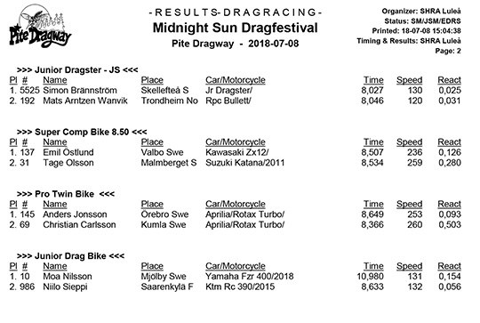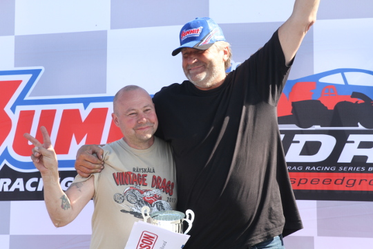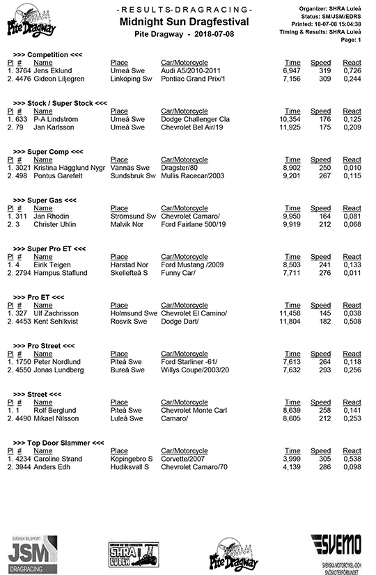 It was almost too good, as the drivers got the oportunity to drive so many qualification rounds that they got worn out. That doesnt happen very often. But all drivers was happy and the event produced a lots of  good times at the good track. In Stock/Super Stock was 7 out of 8 cars from same town, Umeå. The winner of the class was P.A Lindström and Ulf Zachrisson won ET Pro Super Series and is by that qualified for the Finals at Tierp Arena i August.