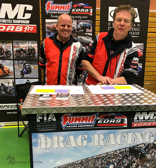 Gideon “Gidde” Liljegren stopped by the Speedgroup booth and was updated with this year’s Summit Racing EDRS Series calendar. Gidde will run Competition again this year.