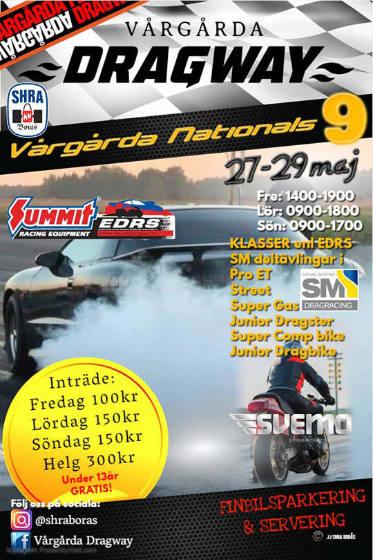 Vårgårda Nationals 9 on May 27-29th host not only the fourth race in Summit Racing EDRS Series, but also Swedish Championship in Street, Pro ET and Super Gas. A bit of an extra thrill as it is a directly decisive event for these classes. And the first champion event in Jr Dragster. Last registration day for this full packed event is May 9th, so don’t think to long. The season is on and we´re racing again!