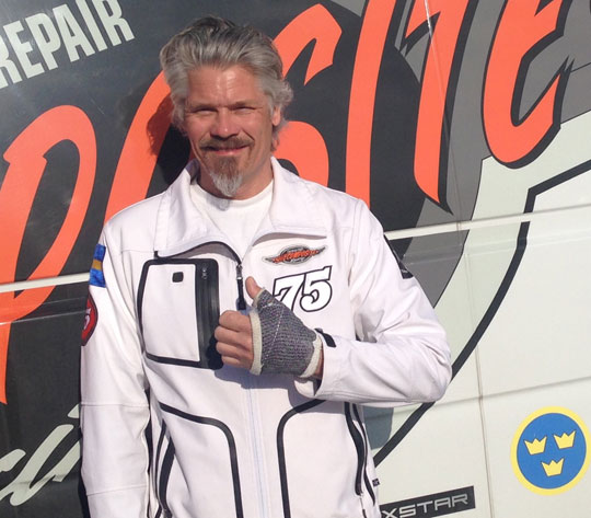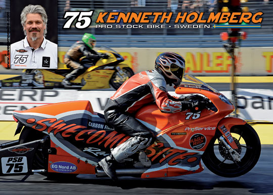 To be involved in a motorbike crash is never a good idea, but to do it just before the start of the racing season is even worse! And that’s what happened to Pro Stock Motorcycle rider Kenneth Holmberg. “Yes I know, this is not good timing at all, but it won’t stop us from starting the season at Santa Pod and doing the full FIM and EDRS Pro Nordic Motorcycle Championship tour,” said the Swecomposite rider.