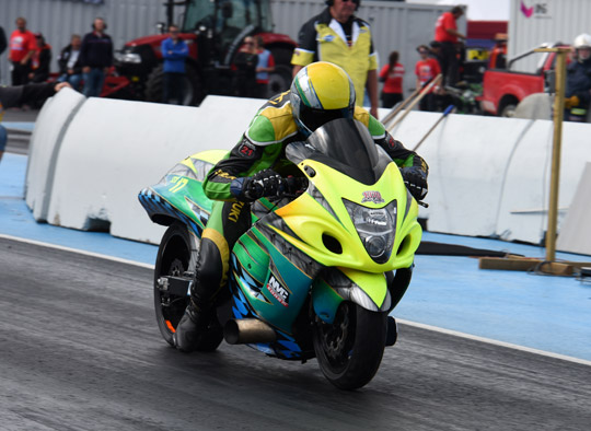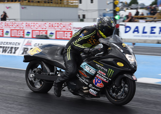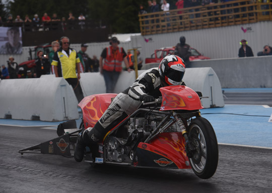 In Top Fuel Motorcycle, number one qualifier Rikard Gustafsson had to withdraw from eliminations with crankshaft problems. This handed Shaun Branch a bye run to the semi-finals and final.