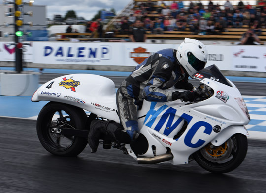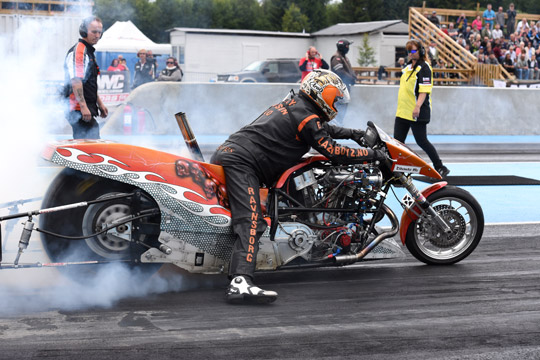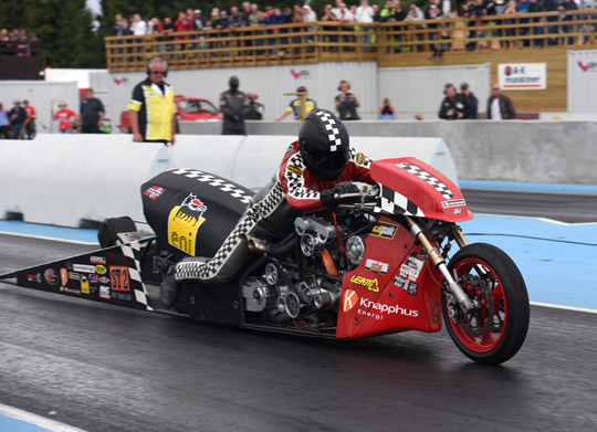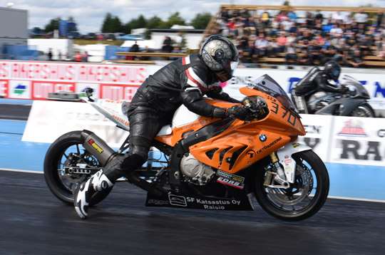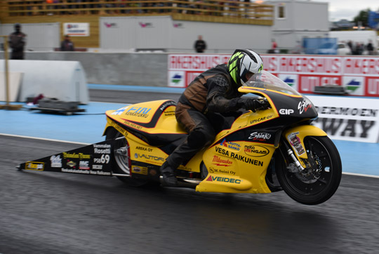 In Pro Stock Motorcycle Kalle Lyrén impressed once again with a stunning 7.049 seconds at 308 km/h in his first round against Bo Thorselius. As Lyrén had a bye run in the semi-final, the number one qualifier would have been in the final. As number two qualifier, Timo Savolainen and number three Thomas Olsen had a bye run in the first round, they had to face each other for a place in the final. But long before that race, the rain brought an early end to the eliminations.