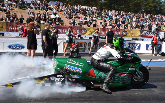 Pro Stock Motorcyle was dominated by 2014 EDRS Pro Nordic MC champion Kalle Lyrén. The Veidec Lyrén Motorsport rider was number one qualifier in all four races and being both quick and consistent, Lyrén stayed unbeaten in eliminations. On his way to the title, the 2016 champion also recorded his first ever 6-second runs in Europe.