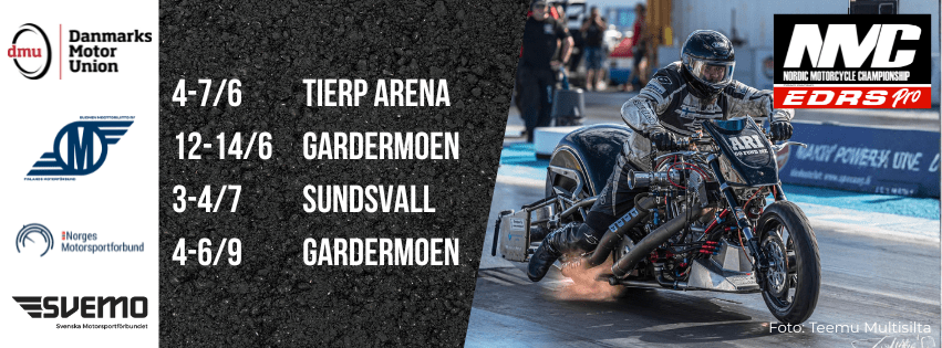 Race Calendar EDRS NMC 2026 EDRS Nordic Motorcycle Drag Racing Championship Classes included in EDRS NMC:Top Fuel MC, Pro Stock MC, Super Twin MC, Super Street Bike