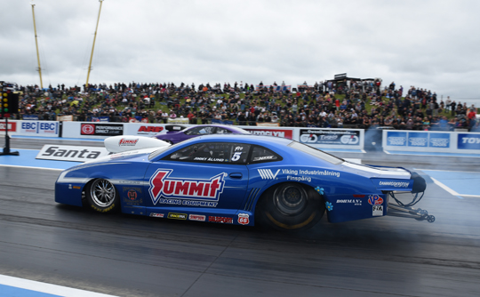 In Top Fuel Anita Mäkelä from Finland couldn’t improve on his Saturday performance, but her 3.870 seconds was enough to claim the number one qualifying position after four runs. Saturday’s numbers two and three, Liam Jones (3.887 seconds) and Stig Neergaard (3.917 seconds) couldn’t improve on their earlier performance either and so the top three remained as it was after Saturday qualifying.